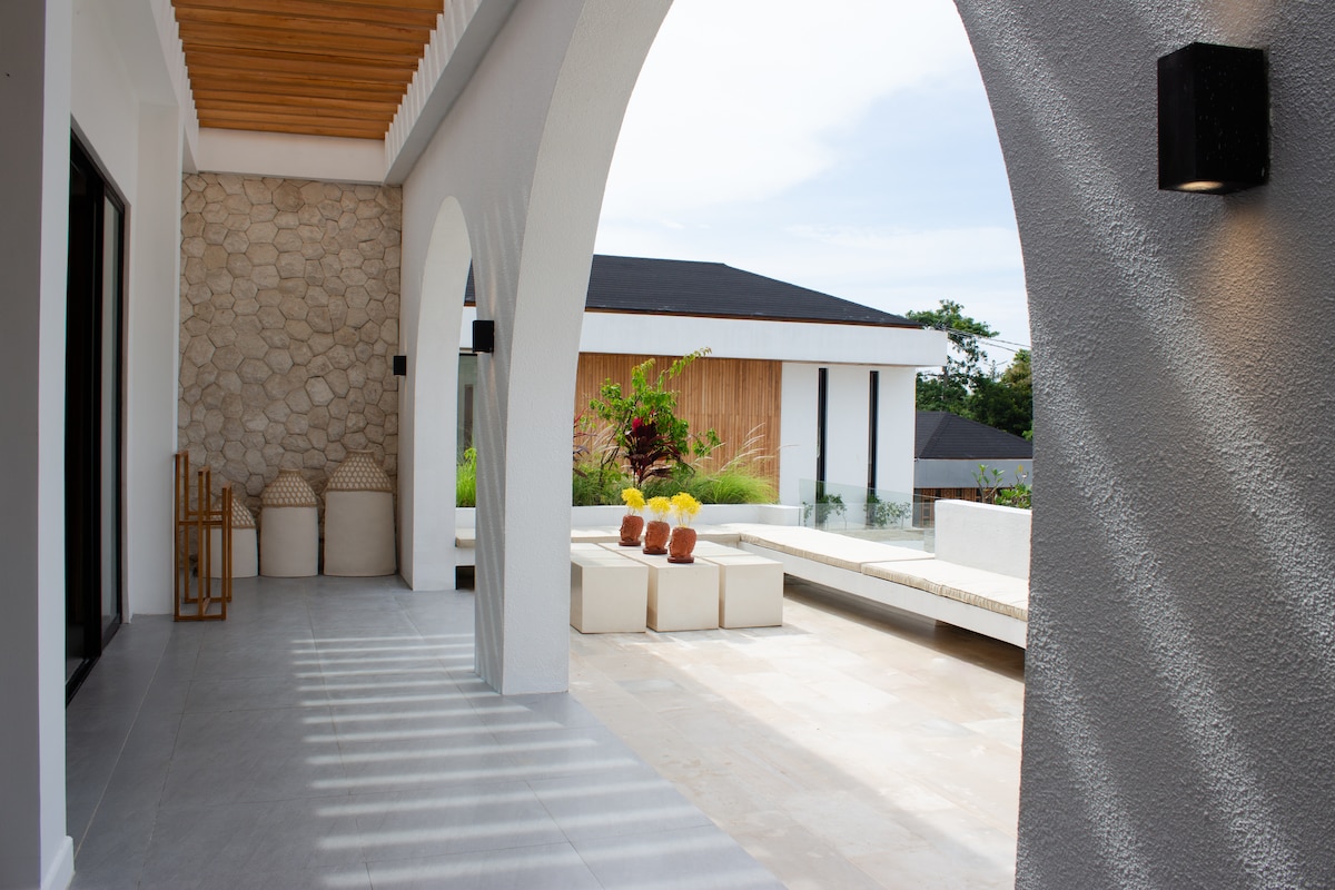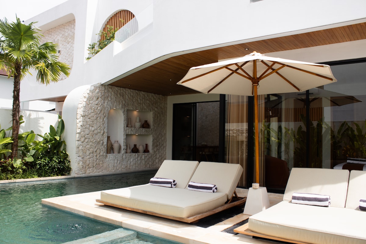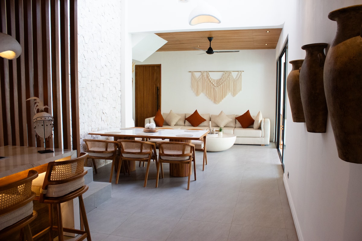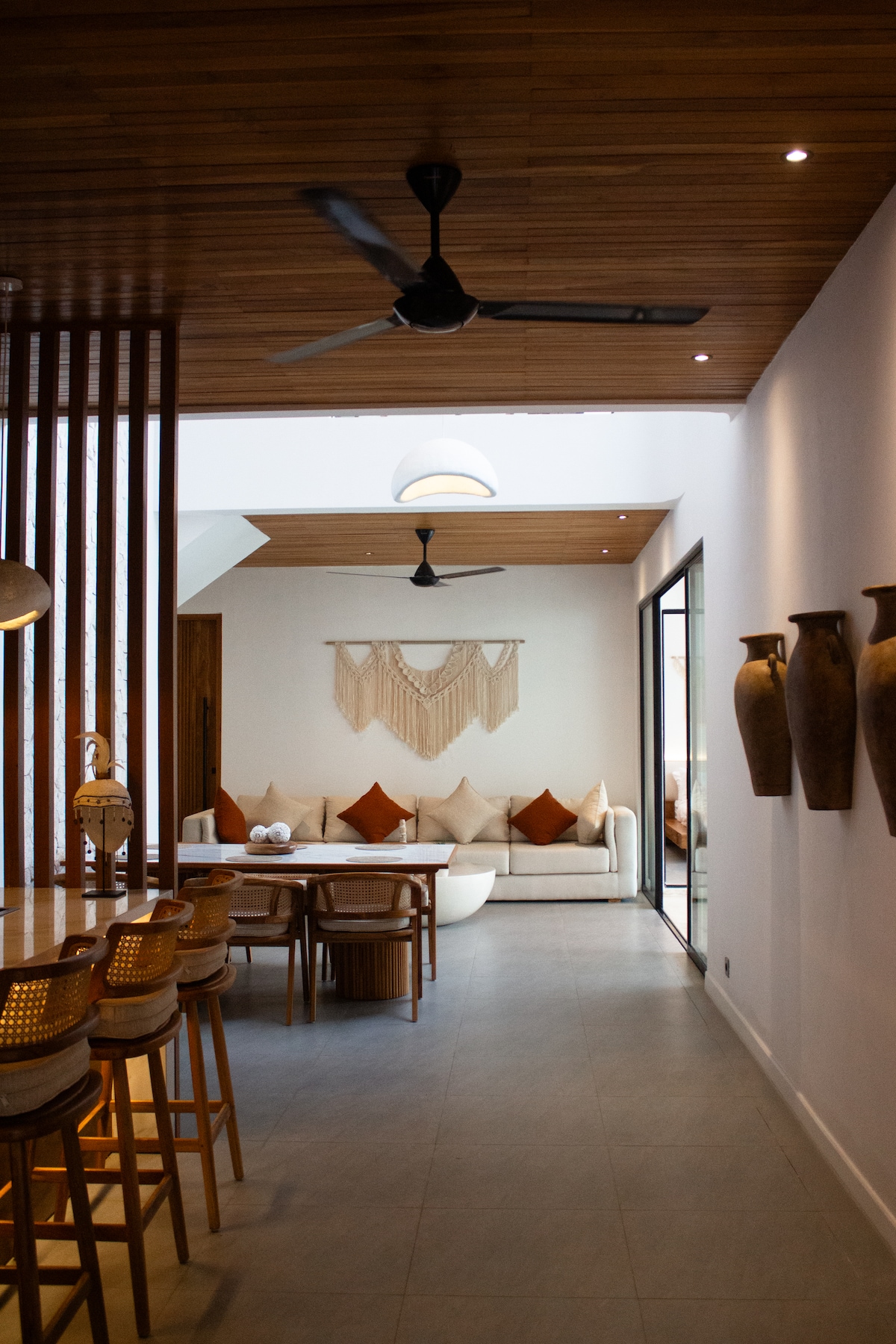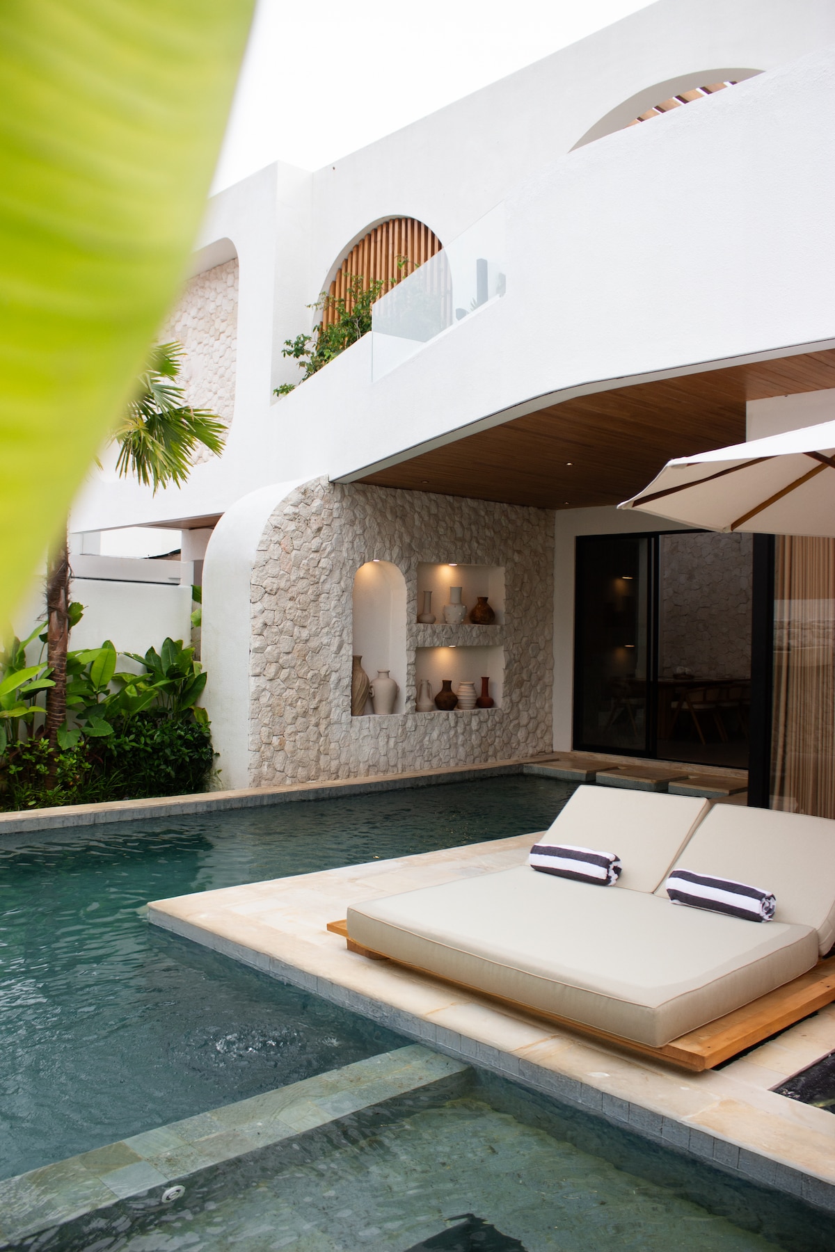 Villa Uluwatu is a beautiful three-bedroom home designed in a refined bohemian luxury style, blending natural materials, warm wood, and white stone. Soft tones of white and cream create a bright and elegant atmosphere. Enjoy the L-shaped pool with a cascading fountain and a cold jacuzzi. The villa also features a large upstairs terrace, with daily housekeeping and security included.
